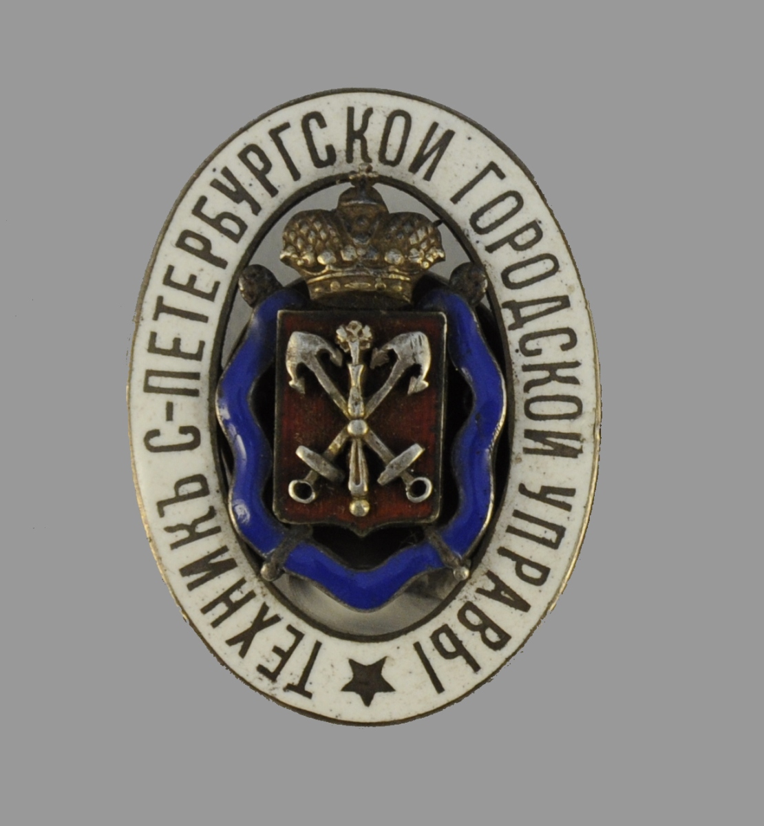 Russie - Insigne de technicien de la municipalité de Saint-Pétersbourg, en argent et émail, fabrication en quatre parties, monté sur vis.
