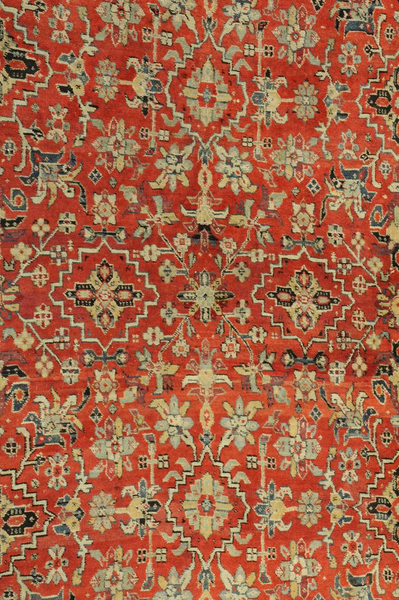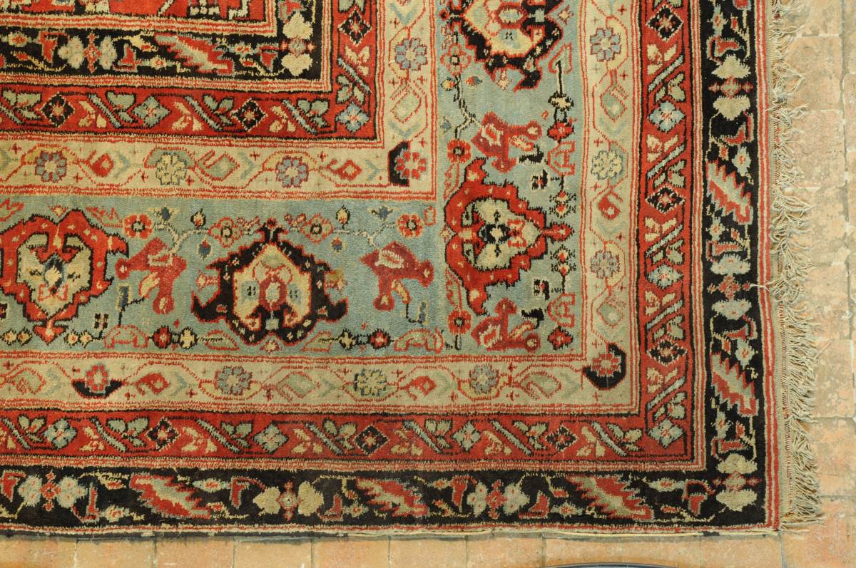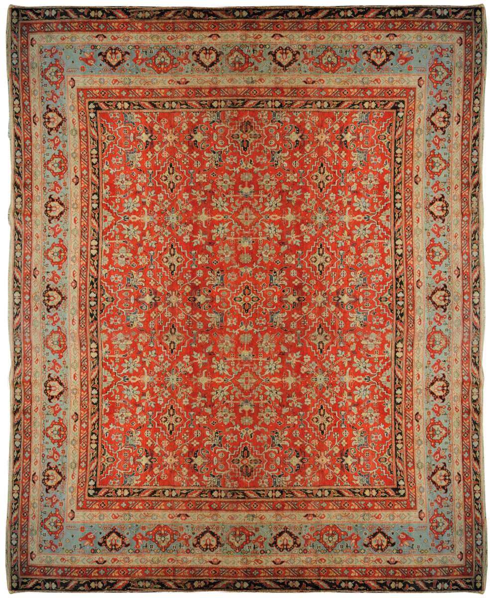 en laine à points noués, à fond rouge, bordures multiples sur fond turquoise.