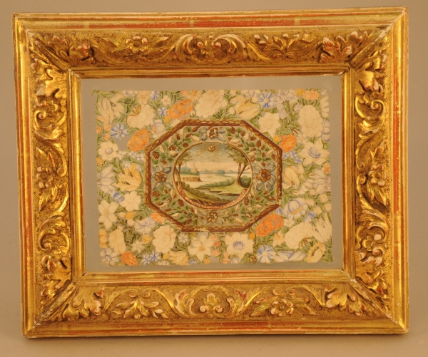 Canivet aquarellé sur papier découpé au canif, titré au centre, signé au dos, dans un cadre en bois doré.