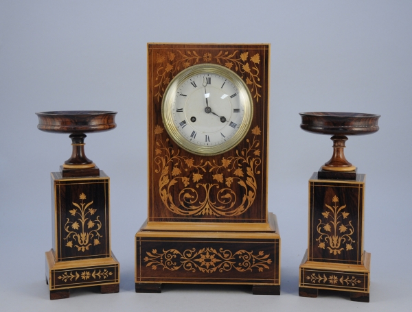GARNITURE de CHEMINÉE en bois de placage et marqueterie florale, composée d'une pendule en borne et de deux vasques sur gaine.