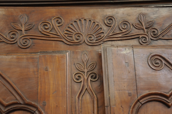 ARMOIRE en bois naturel mouluré et sculpté. Décor de volutes, palmettes et feuillages stylisés, la traverse inférieure chantournée. Les pieds antérieurs cambrés à enroulements.