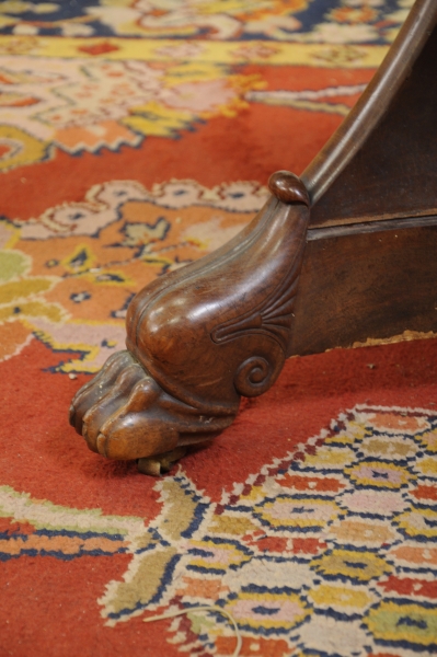 GUÉRIDON circulaire en placage d'acajou. Le plateau marqueté en ronces rayonnantes autour d'une croix de Malte dans un double médaillon. Piètement tripode terminé par des griffes ailées aux fleurs de lotus, roulettes.