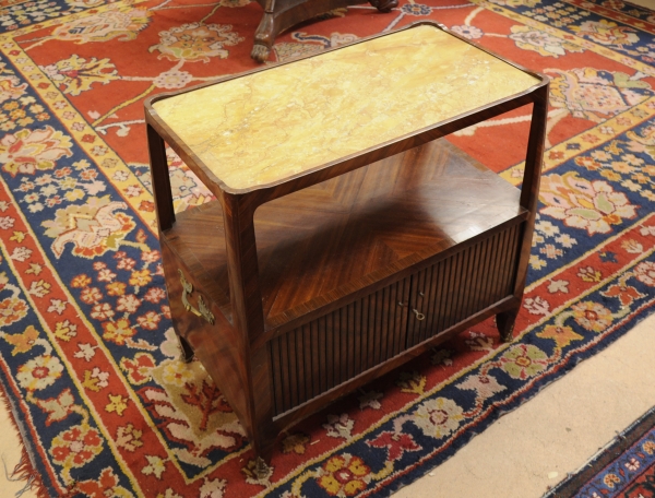 DESSERTE en placage de bois de rose et ornementations de bronze ciselé, la partie supérieure ajourée à plateau de marbre jaune intégré, la partie inférieure ouvrant par un rideau flanquée de poignées à décor mouvementé, repose sur des pieds légèrement cambrés à sabots.