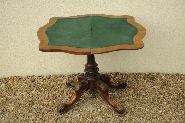 TABLE à JEUX en bois de placage, bois sculpté et marqueterie florale, le plateau pliable de forme violonnée reposant sur un fût à piètement quadripode à décor d'enroulements et palmettes. Repliée, forme une console.