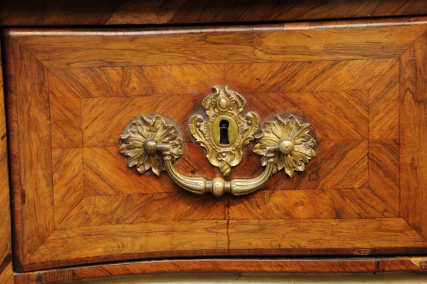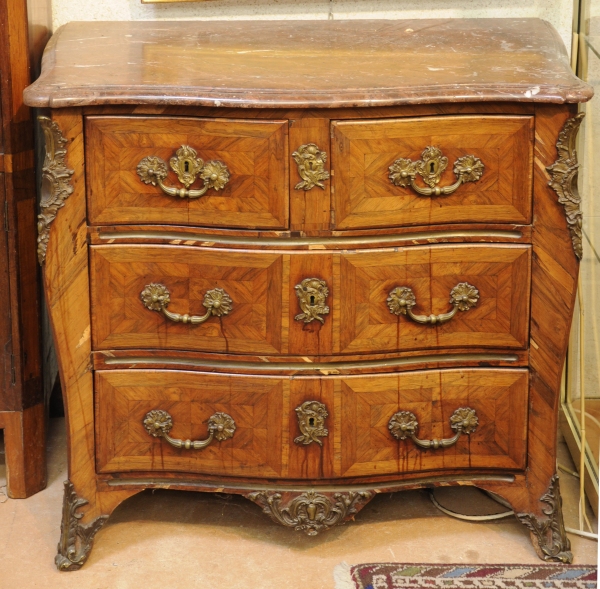 COMMODE en bois de placage de forme galbée. Elle ouvre par quatre tiroirs sur trois rangs. Les montants cambrés à ornementations de bronze à décor de chutes d'angles stylisées terminés par des pieds en sabot à acanthe stylisée. Le cul-de-lampe à décor d'un cartouche feuillagé. Dessus de marbre rouge griotte.