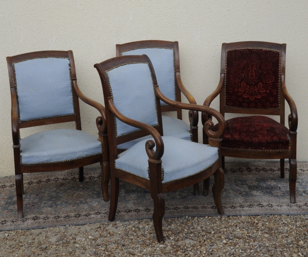 Suite de QUATRE FAUTEUILS en noyer, les accotoirs à crosses, les pieds antérieurs en jarret.