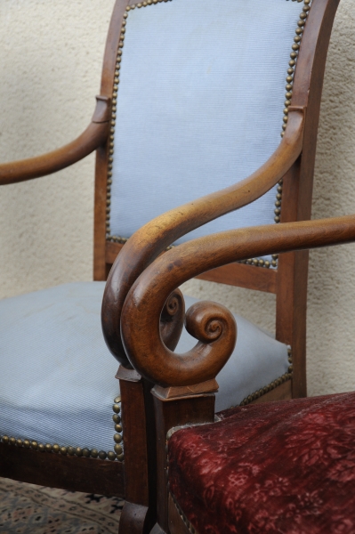 Suite de QUATRE FAUTEUILS en noyer, les accotoirs à crosses,...