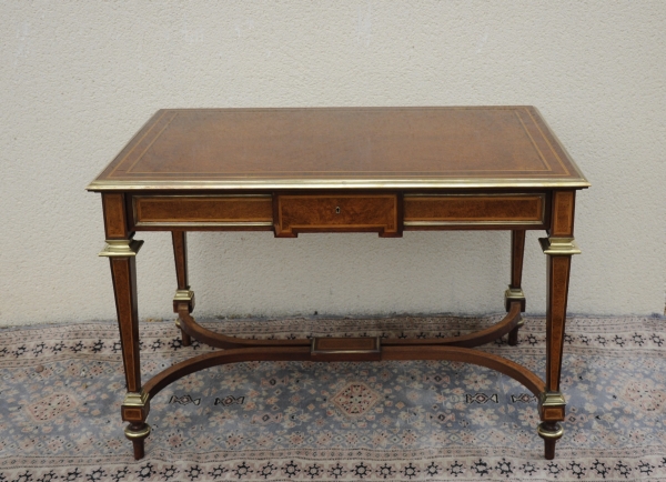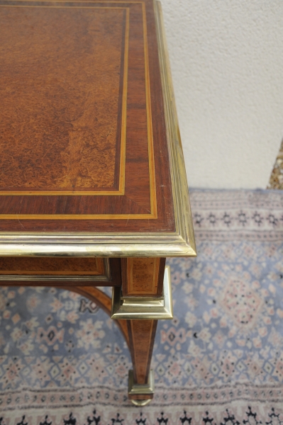 TABLE-BUREAU rectangulaire en placage de loupe, filets de bois clair et teinté, encadrements et bagues de laiton; elle ouvre par un tiroir en ceinture à ressaut central. Le plateau est ceint d'une lingotière; les pieds en gaine sont réunis par une entretoise en 'X' et terminés par des pieds toupies.