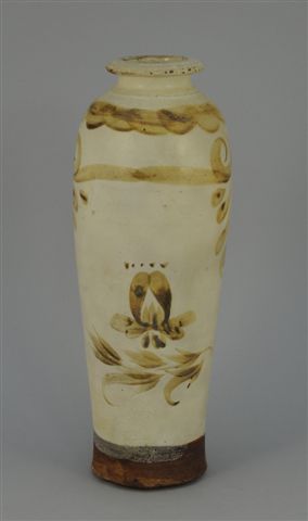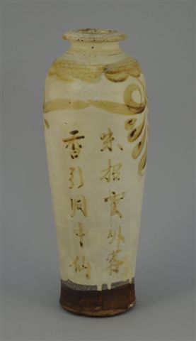 VASE ovoïde en grès sous couverte à décor de fleurs stylisées et idéogrammes chinois sur fond ivoire. Chine. XIXème ? Haut. 37 cm.