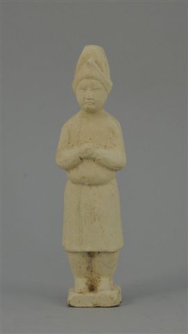 Céramique de la chine. Époque TANG (618-907). STATUETTE de gardien debout en terre cuite, les mains croisées sur la poitrine.