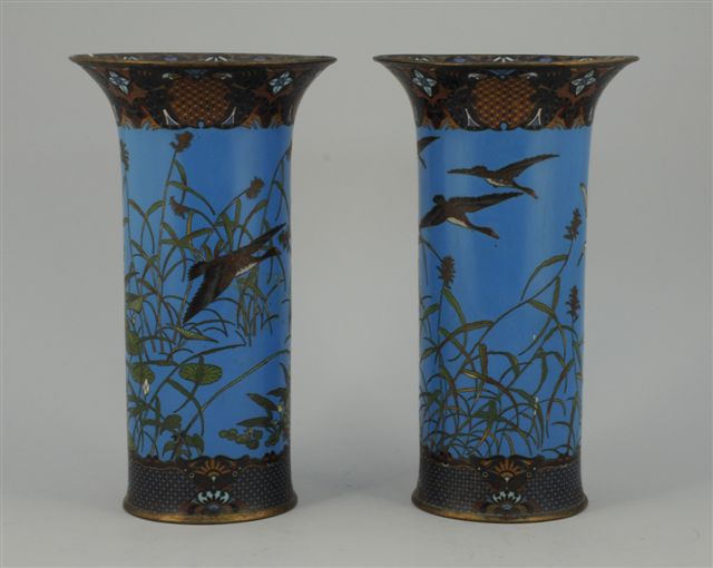 Paire de VASES rouleau en cloisonné à décor de grue et lotus sur fond bleu. Japon Vers 1900. Haut. 29,5 cm
