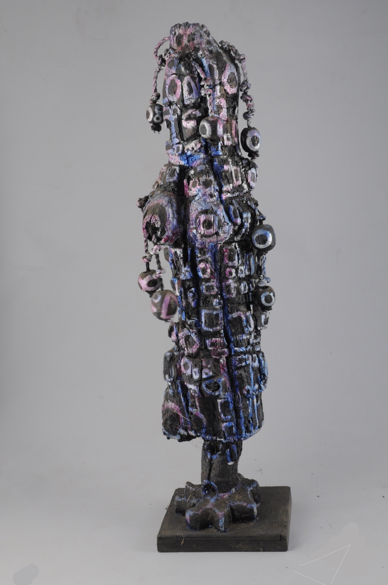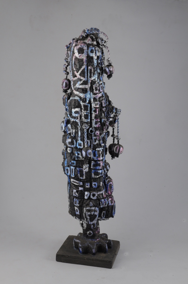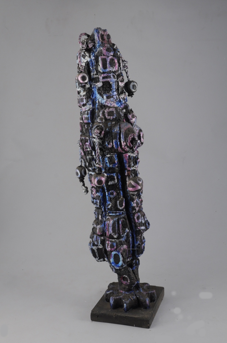 Sculpture en bois brûlé, corde à nœuds, peinture argentée, bleue, rose