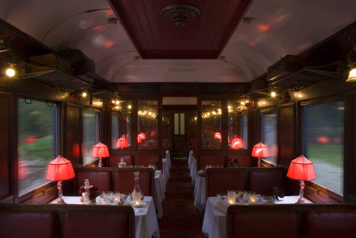 Très bon état général intérieur. Les boiseries de la salle de restaurant, les tables et les chaises d'origine sont en acajou massif (les plateaux des tables ont été habillés de formica). Les panneaux de marquetterie viennent de Grande-Bretagne. Les porte-bagages en laiton massif sont égalemement d'origine, tout comme les éclairages par plafonnier. Les 14 lampes en bronze à abat-jour en soie rouge et les appliques flambeaux en bronze sont des rééeditions conformes, d'après le modèle d'origine.