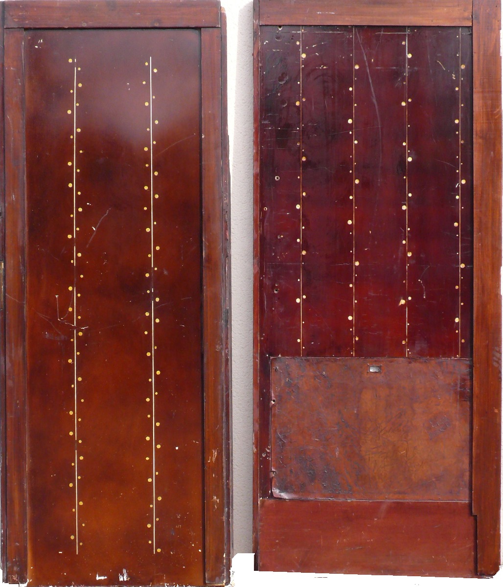 - deux portes à décor gravé et laqué de motifs géométrique et floraux, 189 x 62 cm et 205 x 81 cm,