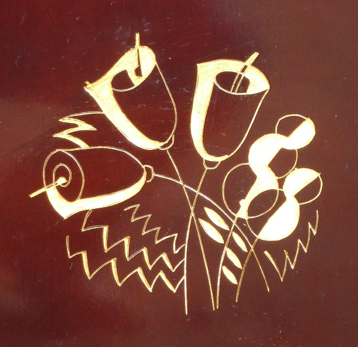 - un grand paneau mural à décor gravé et laqué de motifs géométrique et floraux,170 x 194 cm,