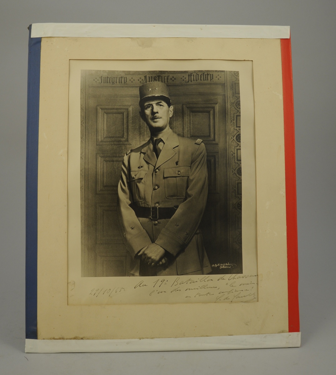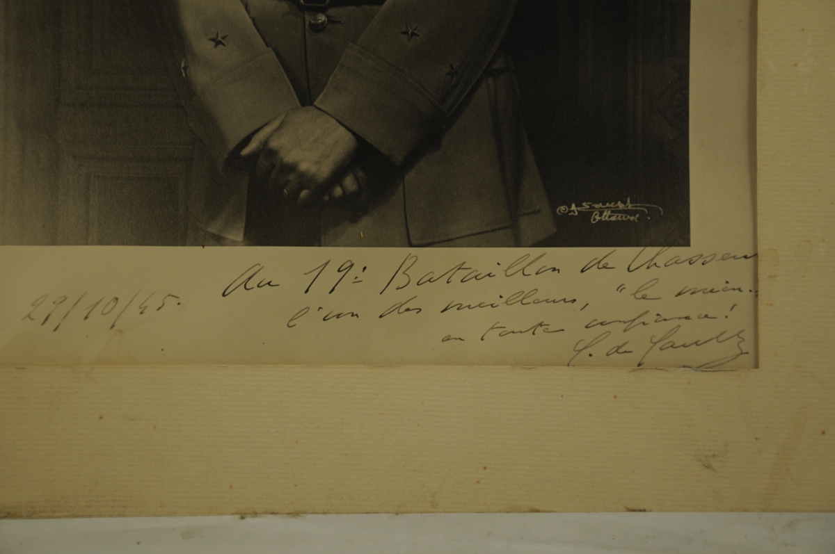 SAURT. Portrait du Général de Gaulle avec envoi : "29/10/45 "au 19e batallion de Chasseur / l'un des meilleurs "le mien", / en toute confiance / C. de Gaulle". Tirage argentique dans un encadrement bleu blanc rouge. 32,5 x 25 cm.