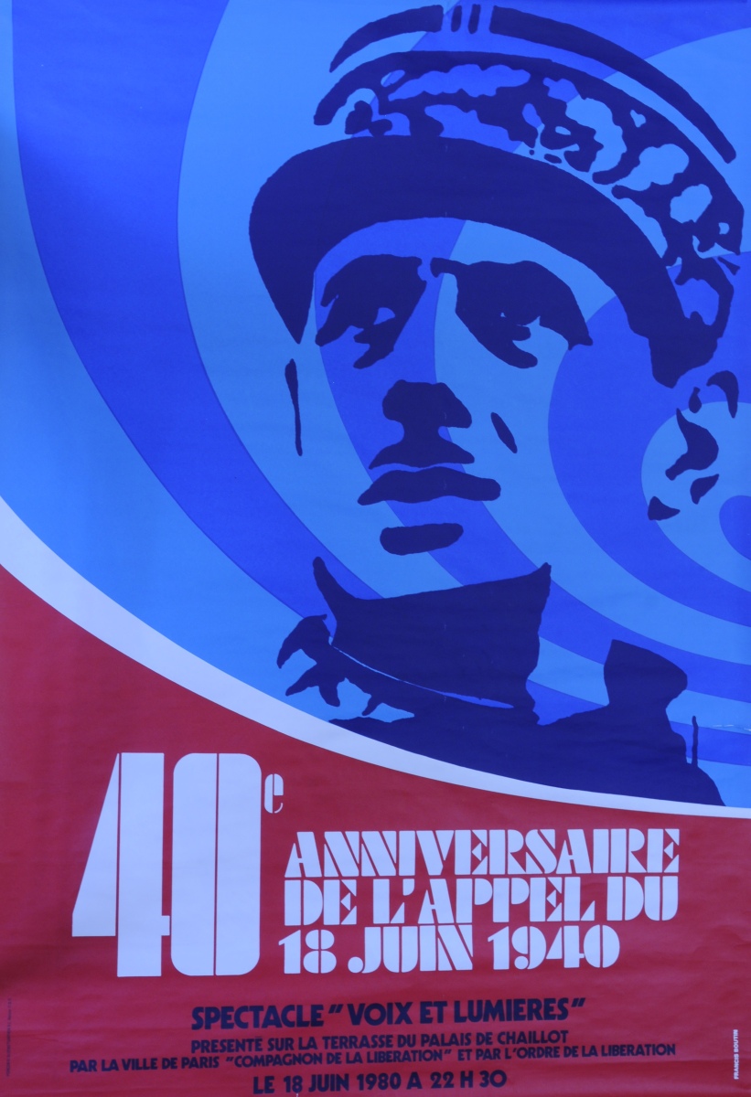 AFFICHE "40e ANNIVERSAIRE DE L'APPEL DU 18 JUIN 1940", spectacle voix et lumières au Palais de Chaillot, 18 juin 1980. 175 x 120 cm (petite déchirure en bas).