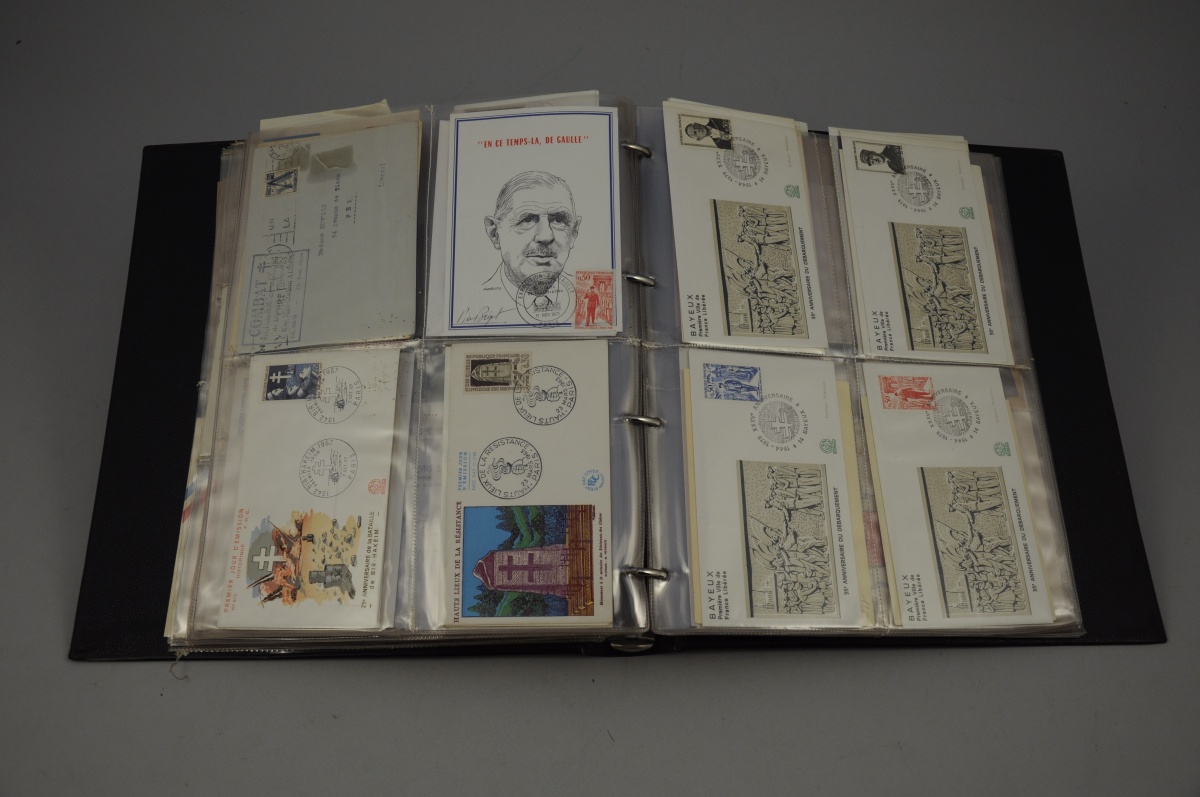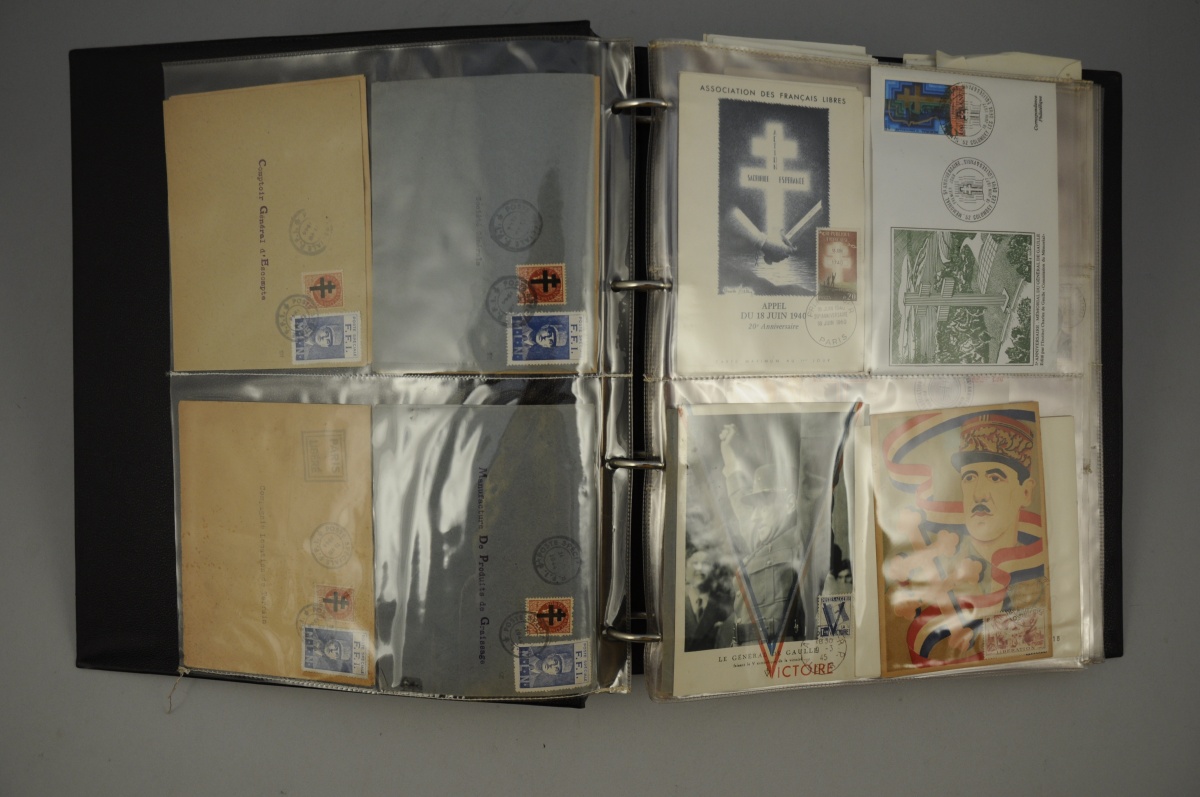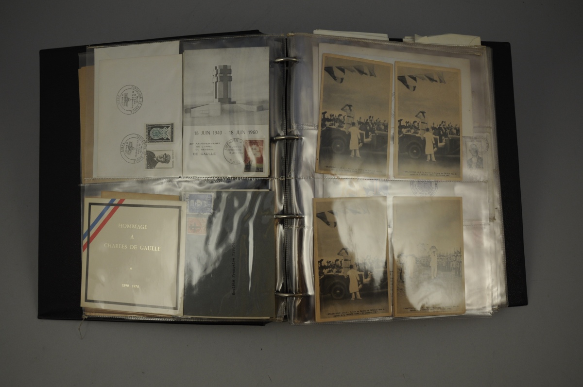 CLASSEUR PHILATÉLIQUE : L'EMPIRE FRANÇAIS. 17 pochettes comprenant cartes postales, enveloppe premier jour, photographies, document, etc.