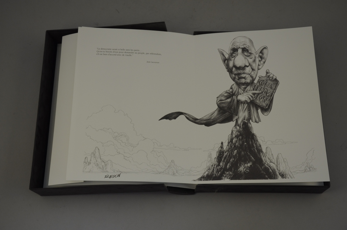 Jacky REDON. "De Gaulle vous regarde". Caricatures et dessins originaux réunis dans un coffret, n°1212/2000, éd. Arts et Lumière, 2002.