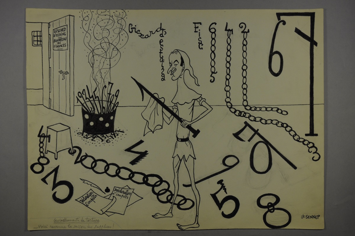 SENNEP. "Les instruments de torture, voici revenue la saison des supplices. Giscard d'Estaing, bourreau des finances." Dessin original à l'encre pour le Figaro du 24 janvier 1962. Signé et titré. 27,5 x 37 cm.