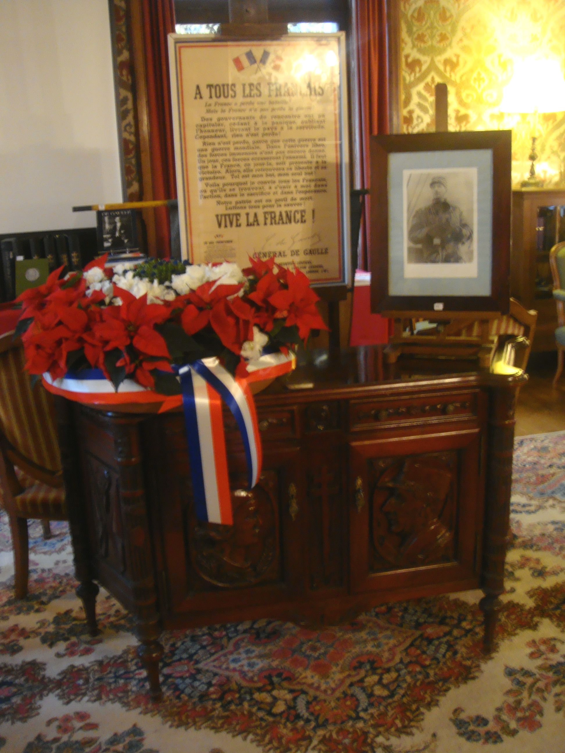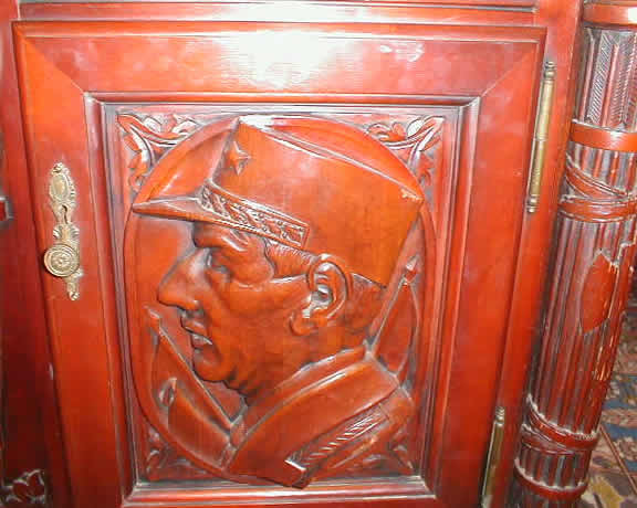 Les portes sont ornées de portraits/figures de profil sculptés du Général et de Marianne. Croix de Lorraine sur l'entre deux. Les cotés sont ouvragés de drapeaux surmontés du bonnet phrygien. Les quatre montants sont en faisceaux de licteur.