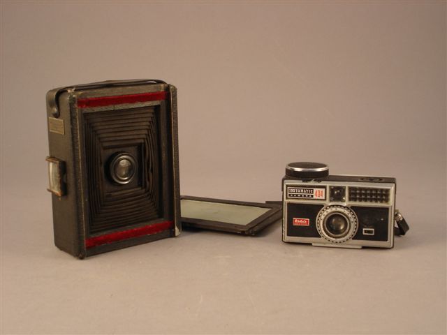 Ensemble de DEUX APPAREILS PHOTOGRAPHIQUES comprenant un KODAK INSTAMATIC 404 et un PHOTO-PLAIT pliant, à soufflet, type Folding avec plaque verre, dans un étui en cuir. Joint une paire de jumelles marquées "LE JOCKEY CLUB - PARIS".