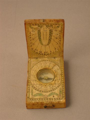Diam. 5 cm. Joint une boussole dans un coffret en bois et indication des heures avec cadran solaire (Seconde moitié XVIIIème siècle).