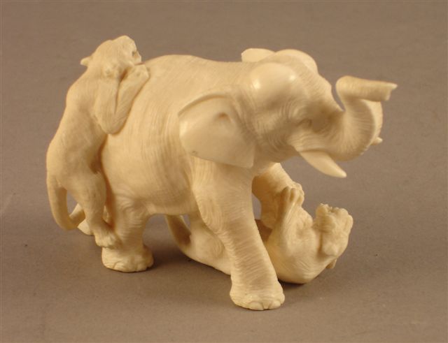 IVOIRE. Éléphant attaqué par deux tigres. Haut. 6,5 cm.