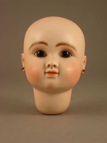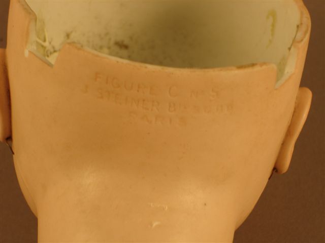 TÊTE DE POUPÉE en porcelaine marquée en creux "FIGURE C N° 5 J. STEINER PARIS". Yeux marron vert, sourcils bruns et cils finement soulignés de noir, bouche fermée, oreilles percées de petites perles rouges.