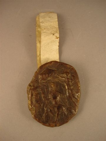 CACHET en cire représentant le roi de France, assis sous un dais, muni des Regalia et sur le revers les armes de la Maison de France. Fragments de vélin.