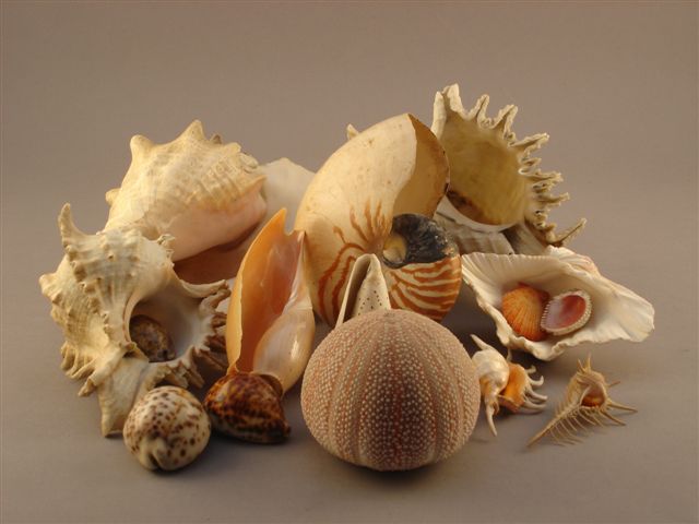 Ensemble de QUINZE COQUILLAGES comprenant un nautile, un strombe, deux murex, un oursin, un bénitier, un lambis, un murex pecten, trois cyprées, deux bivalves, un cône et un coquillage à volutes rose orangé.