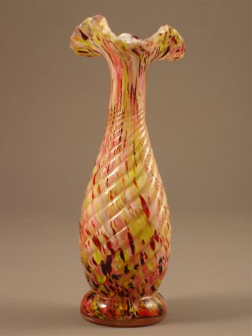 VASE balustre en verre soufflé moulé, parsemé de poudres vitrifiées jaune, rose et brun. Col resserré polylobé à l'imitation d'une corolle florale. Panse décorée de godrons spiralés.