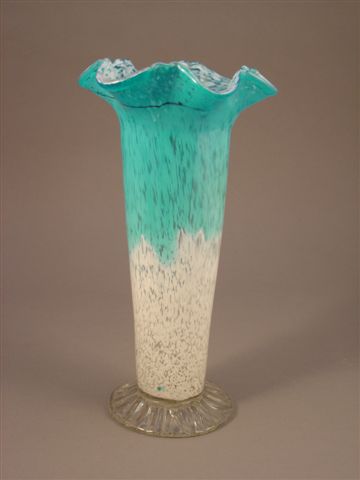 VASE cornet en verre soufflé moulé, nuagé de vitrifications intercalaires, bleu azur dans la partie supérieure, blanc laiteux en bas. Large col corolle hexagonal mouvementé. Base circulaire à décor de feuilles d'eau.