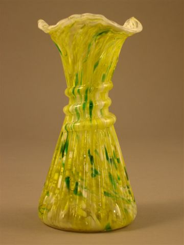 VASE tubulaire en verre soufflé moulé, coloré de vitrifications intercalaires vert, jaune et blanc laiteux. Col quadrilobé mouvementé. Décor tournant de spirales dans la partie supérieure et de godrons sur la panse. Base élargie.