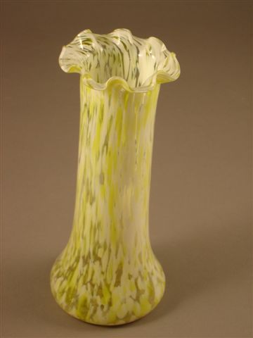 VASE tubulaire en verre soufflé moulé s'élargissant à la base avec inclusion de vitrifications intercalaires jaune et blanc laiteux. Ouverture mouvementée imitant une corolle florale. Base élargie.