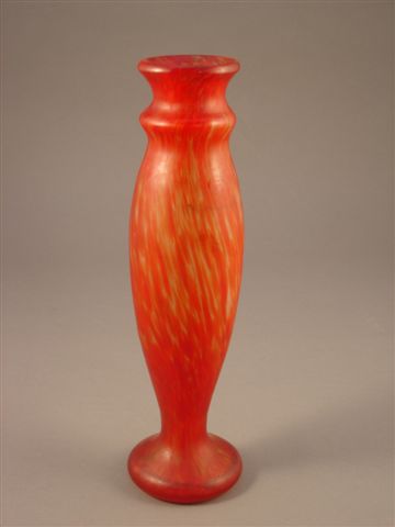 VASE rouleau s'élargissant en piédouche en verre soufflé moulé, marbré de vitrifications intercalaires à dominante rouge orangé. Petit col ourlé façonné à chaud.