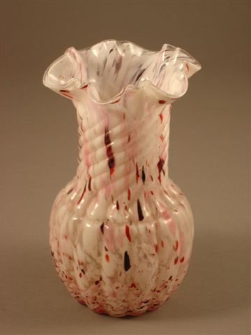 VASE balustre en verre soufflé moulé, nuagé de vitrifications intercalaires rose, brun et blanc. Ouverture mouvementée hexagonale imitant une corolle florale. Col à décor de fines côtes spiralées. Panse godronnée.