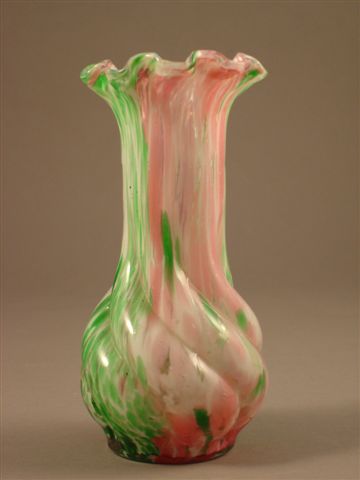 VASE rouleau en verre soufflé moulé, nuagé de vitrifications intercalaires rose, vert et blanc laiteux. Haut col se terminant en corolle polylobée. Panse godronnée.