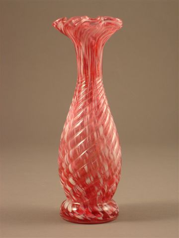 VASE balustre en verre soufflé moulé rose double-couche parsemé de poudres vitrifiées de couleur blanche. Col resserré polylobé à l'imitation d'une corolle florale. Base renflée s'élargissant en piédouche.