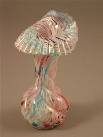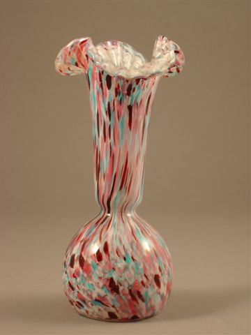 Ensemble de DEUX VASES rouleau en verre soufflé moulé, moucheté de vitrifications intercalaires rose, bleu, brun et blanc laiteux. Large col ondulé imitant une corolle florale. Panse élargie.