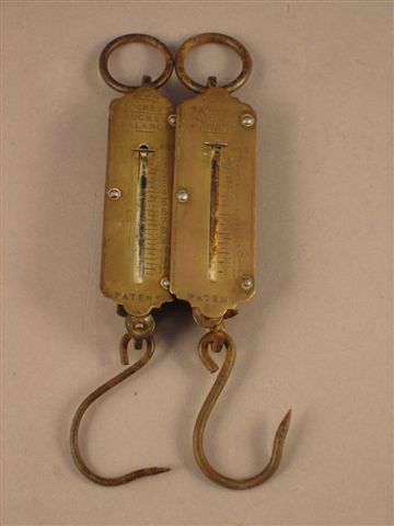DEUX PESONS en acier et laiton comprenant une attache en forme d'anneau, un ressort dont on mesure l'allongement à l'aide d'une réglette graduée de 0 à 12 kilogrammes et un crochet. L'un marqué "HUCHES'S POCKET BALANCE" et l'autre "SALTER'S POCKET BALANCE". Grande-Bretagne.