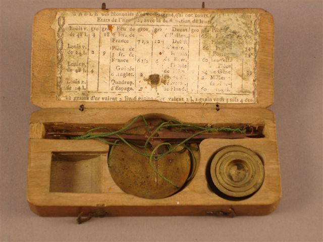 BALANCE DE CHANGEUR en acier poli comprenant un petit fléau à bras égaux dont le point d'appui est constitué par un couteau central. Aux extrémités du fléau sont suspendus deux petits plateaux en laiton destinés à peser les pièces de monnaie. Dans un coffret rectangulaire en noyer.