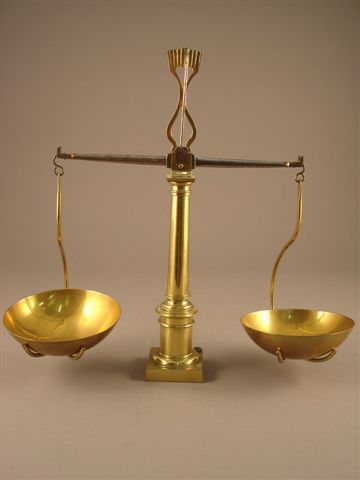 BALANCE À COLONNES en laiton doré. Elle se compose d'une colonne qui soutient verticalement le fléau central aux extrémités duquel sont suspendus deux plateaux.