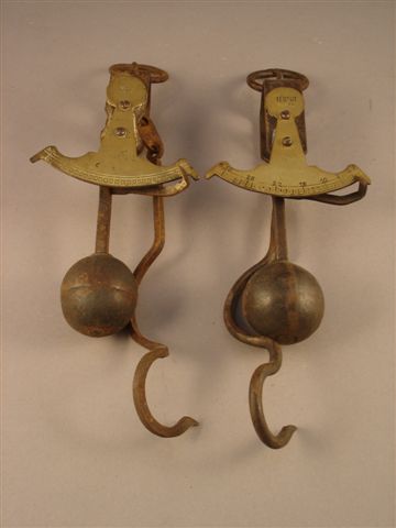 DEUX BALANCES TESTUT de métier en acier forgé constituées d'un anneau d'attache, d'un cadran gradué de 0 à 30 kilogrammes en forme de balancier, d'un contre-poids rond et d'un crochet.