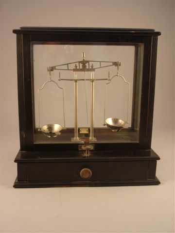 BALANCE D'APOTHICAIRE par VIOLLET en acier poli brillant. Elle est constituée de deux colonnes jumelles sur lesquelles prend appui un fléau rigide en forme de losange. À chacune des extrémités du fléau, deux couteaux équidistants supportent deux plans horizontaux auxquels sont fixés des étriers soutenant deux petits plateaux. Une aiguille solidaire du fléau permet de mesurer les oscillations. Protégée par une vitrine, elle repose sur un socle rectangulaire en bois noirci démasquant un tiroir en ceinture. Gravée sur la base, dans un cartouche de forme octogonale, "G. VIOLLET 48, RUE LAFAYETTE PARIS".