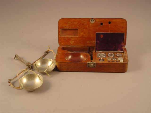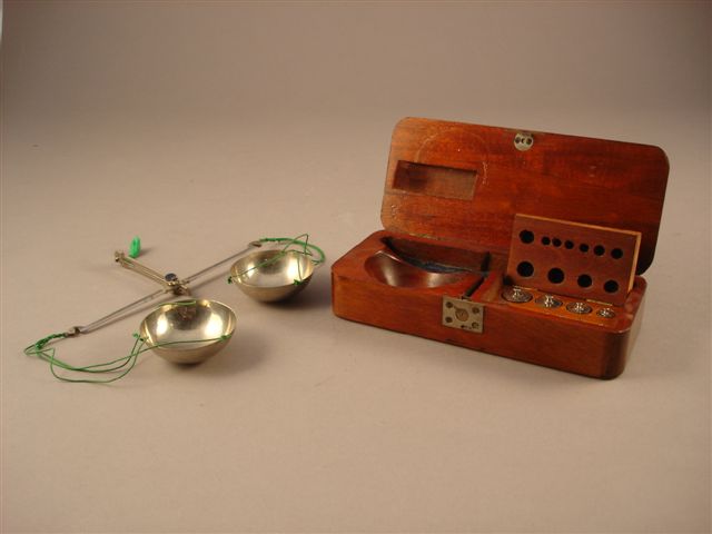 DEUX BALANCES DE CHANGEUR en acier poli comprenant un petit fléau à bras égaux dont le point d'appui est constitué par un couteau central. Aux extrémités du fléau sont suspendus deux petits plateaux destinés à peser les pièces de monnaie. L'une de marque SECRÉTAN dans un étui rectangulaire en noyer, l'autre dans un étui ovale.