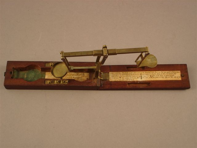 BALANCE DE CHANGEUR en laiton. Elle comprend un petit fléau à bras égaux dont le point d'appui est constitué par un couteau central pivotant. Aux extrémités du fléau sont suspendus deux petits plateaux destinés à peser les pièces d'or. Étiquette imprimée et signature manuscrite à l'encre noire "WILKINSON". Dans un étui en bois des Îles.