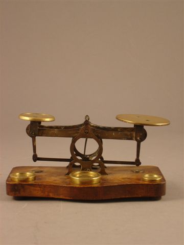 BALANCE TRÉBUCHET en acier poli constituée d'un couteau central sur lequel prend appui un fléau rigide. À chacune des extrémités du fléau, deux couteaux équidistants supportent deux plans horizontaux auxquels sont fixés des étriers soutenant deux petits plateaux en laiton. Une aiguille solidaire du fléau permet de mesurer les oscillations. Elle repose sur un plateau rectangulaire mouvementé.