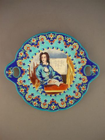LONGWY. PLAT de forme ronde représentant Monsieur de Roberval. Décor tournant sur l'aile d'un semis de fleurs de pommier sur fond bleu craquelé et "bleu de Sèvres" sur la bordure légèrement mouvementée. Monogramme : Rehaussé par Albert KIRCHTETTER (reprend son activité à Longwy en 1942 et quitte son poste en 1976). Blason simple couronné entouré de la mention "ÉMAUX DE LONGWY - FRANCE ATELIER D'ART. Made in France". Marque manuscrite : "Gilles Personne de Roberval. 1602-1675. Tirage limité - décor réservé". Marque imprimée : "DÉCORÉ à la MAIN". Diam. 26 cm.