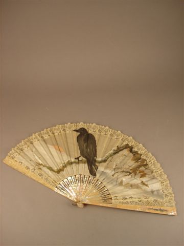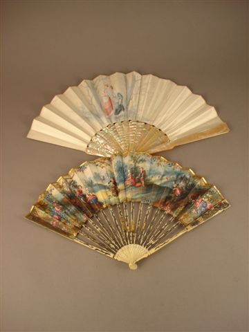 Ensemble d'ÉVENTAILS comprenant trois éventails en ivoire et nacre. Le premier, la feuille en papier peint à la gouache d'une scène champêtre où de jeunes enfants s'adonnent à la cueillette. Au revers : un décor imitant la campagne avec arbustes et petite tour. Monture squelette en ivoire à décor gravé rayonnant. Fin XVIIIème siècle. (accident à la monture). Le deuxième, la feuille en soie imprimée. De jeunes dames, vêtues à l'espagnole avec éventail et mantille, se promènent dans les bois. Au revers : un petit village rehaussé à la gouache. Monture en nacre piquée. XIXème siècle. Le troisième, la feuille en tulle rehaussée de dentelle. Un oiseau, posé sur une branche, assiste au coucher du soleil. La monture en ivoire à décor repercé et nacre. Seconde moitié XIXème siècle.